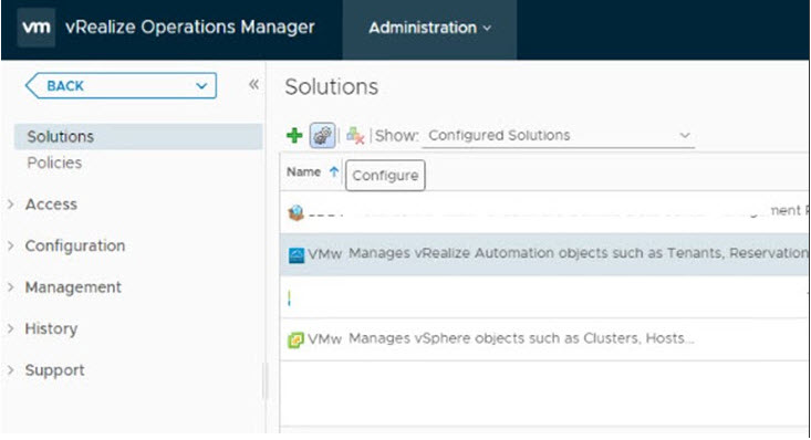 Açılan pencerede Solutions tıklayıp, Show bölümünde Configured Solutions’u seçiyoruz. Aşağıya gelen vRealize Automation tıkladıktan sonra , Configure tıklıyanız.