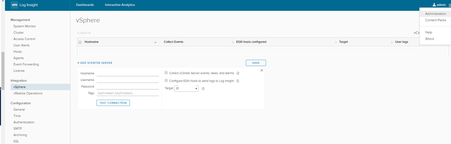 Giriş yaptıktan sonra sağ üst menüde bulunan Admin/Administration/Integration/vSphere tıklayıp , Add Vcenter Server diyerek vcenter bilgilerimizi giriş yaptıktan sonra Save diyerek vcenter sunucumuzu eklemiş oluyoruz.