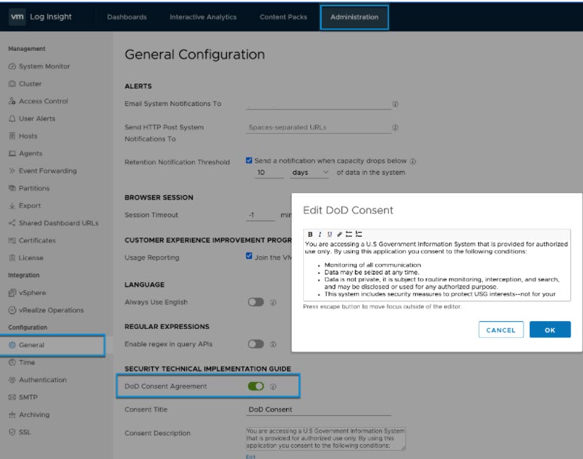 DoD / STIG Özellikleri, Kullanıcı oturum açma işleminin bir parçası olarak zorunlu Savunma Bakanlığı bildirimini ve onay başlığını görüntülemek için bir Savunma Bakanlığı (DoD) onay sözleşmesini etkinleştirebilirsiniz. Yönetim> Yapılandırma> Genel’e gidip burada DoD Onay Sözleşmesini Etkinleştirebilirsiniz.