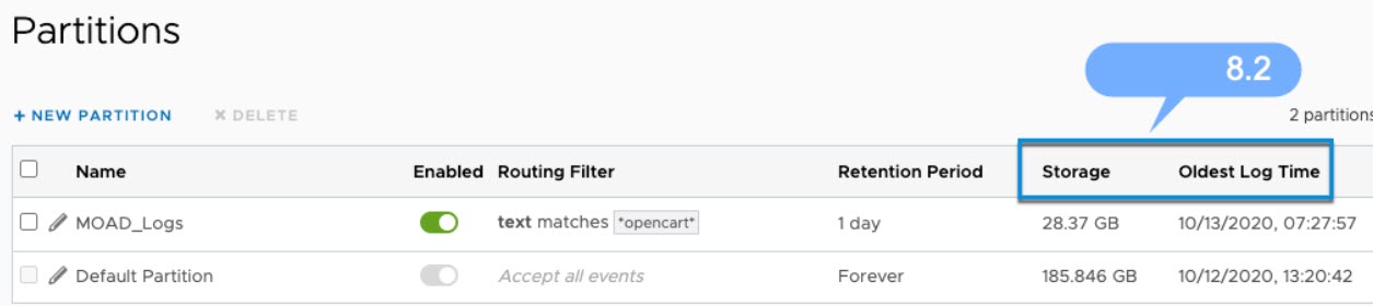 Variable Retention , günlük mesajları ve günlük verileri için farklı saklama süreleri belirlemenize olanak tanımaktadır . Aslında Retention Period 8.1 sürümün bir parçası olarak tanıtılmıştı. 8.2 sürümünde ise her bölümün storage ve eski günlük log zamanlarını’da görebilirsiniz.