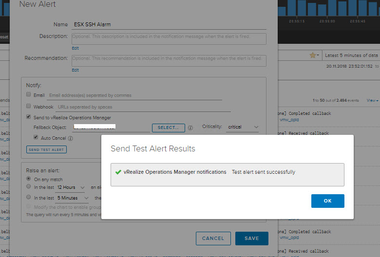 Send test alert dediğimizde başarılı bir şekilde vRealize Operations Manager’a gönderildiğini görmekteyiz.