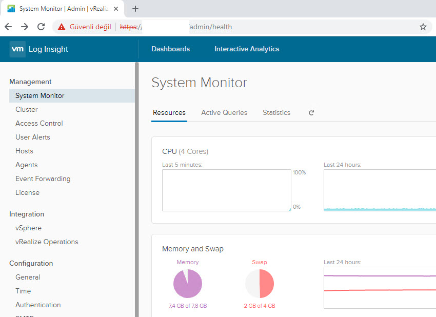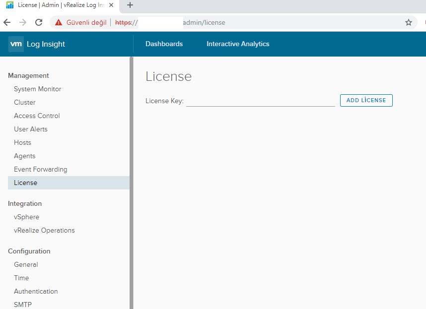 Öncelikle log insight’ın admin paneline girmemiz gerekmektedir. https://ipadresim/admin olarak giriş yapıyoruz.