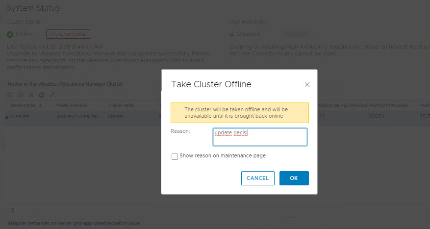 Update işlemini yapabilmeniz için , vRealize Operations Manager Cluster Sistemini Offline konuma getirmeniz gerekmektedir. Bu işlemleri System Status > TAKE OFFLINE > Reason (Update Geçişi Yazabilirsiniz) > OK tıklayıp 3-4 dakika için offline konuma geçmiş olmaktadır.