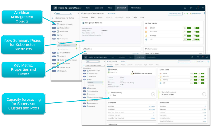 vRealize Operations 8.1 , İş Yükü Yönetimi’ni kullanarak vCenter’da , Ad Alanları, POD’lar ve Tanzu Kubernetes Kümelerinin yeni yapılarını otomatik olarak keşfetme özelliğiyle vSphere’i Kubernetes ile keşfedebilecek ve izleyebilecek. VSphere 7.0’da Kubernetes’in performansını, kapasitesini, kullanımını ve yapılandırmasını izlemek için net yeni özet sayfalarını içerecektir. Kapasite tahmini, kapsüller ve süpervizör kümeleri için kapasite darboğazlarını gösterecek ve İş Yükü Platformunu tam görünürlük ve kontrol ile işlevselleştirmek için kullanıma hazır Gösterge Tabloları, Raporlar, Görünümler ve Uyarılar mevcut olacaktır.