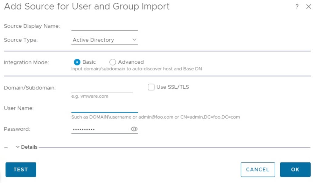 Microsoft AD entegrasyonu için aşağıdaki name ,source type, domain,username bilgilerini tanımlayarak devam ediyoruz. Burada kullanacağınız hesap etki alanı kullanıcı haklarına sahip olması gerekmektedir. Ayrıca, mümkün olduğunda SSL/TLS kullanmanızı tavsiye ederim, çünkü bu, appliance ile domain controller arasındaki LDAP isteklerini şifreleyecektir.