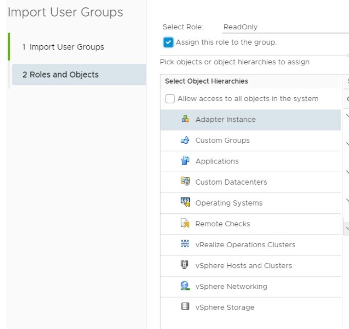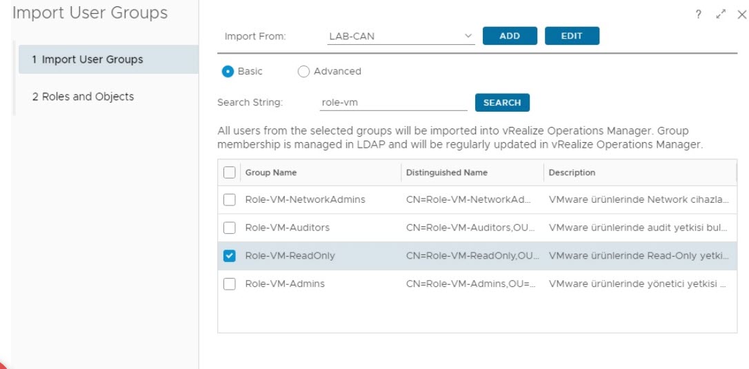 Entegrasyon tamamlandığına göre AD’de vROps’lara erişim rolleri tanımlamak için kullanılacak grupları yapılandırmaya başlayabiliriz. Active directory ‘de oluşturduğumuz grupları öncelikle import ediyoruz.