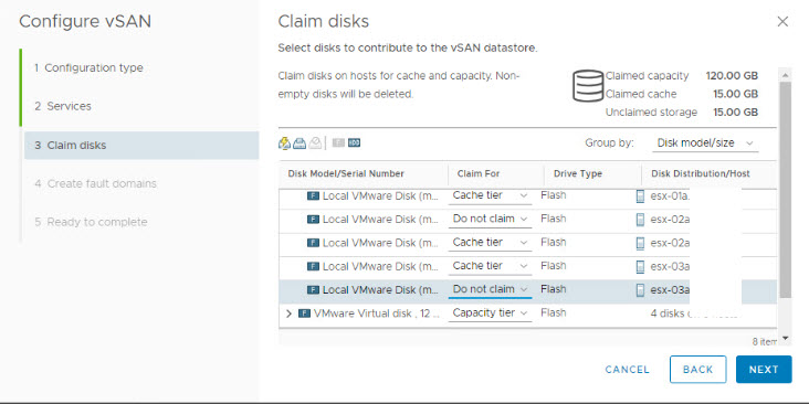 6 adet depolama aygıtından 1*2 yani her esx’inden bir tanesini seçeceğim. 3 Adet esx ortamımdan her bir depolama aygıtını Cache Device olarak seçiyorum ve next diyerek devam ediyorum.