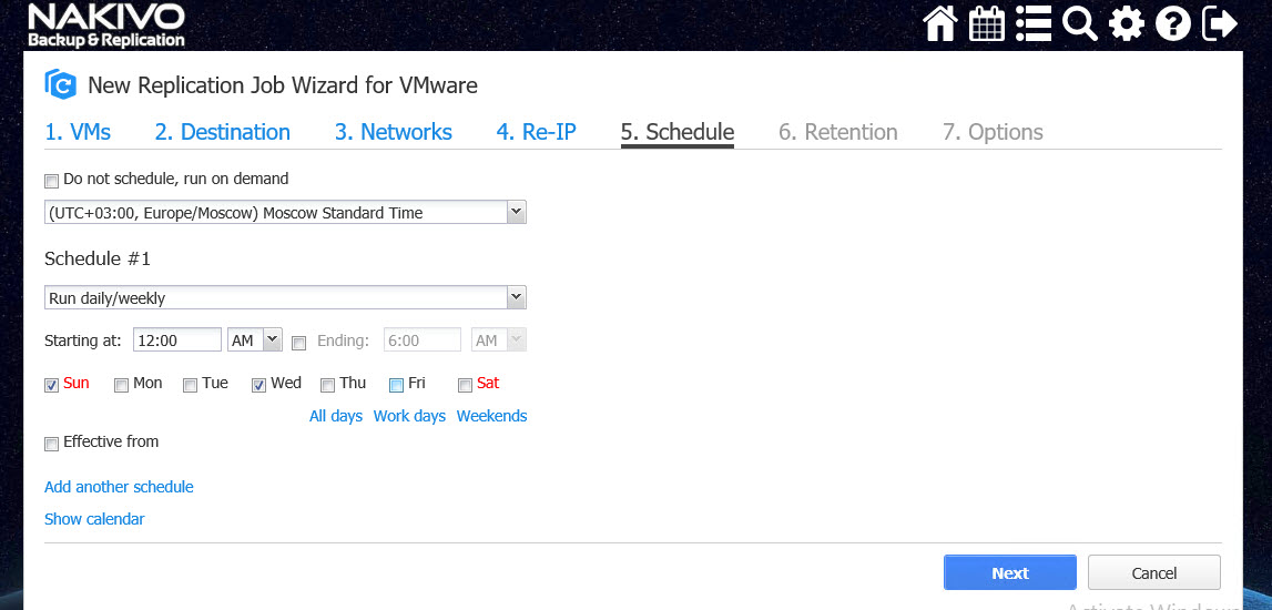 Schedule ‘da ise hangi günlerde replikasyon olsun , saat v.s. ayarları buradan yapabilirsiniz. Her pazar ve çarşamba günü saat 12:00 olarak ayarlayıp next diyerek devam ediyoruz.