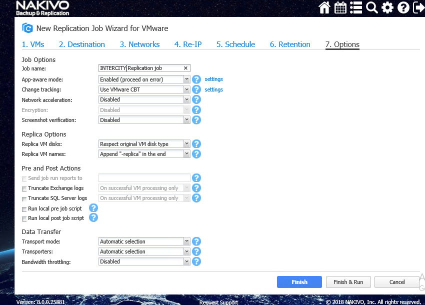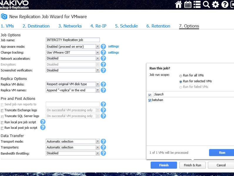 Son bölüm olan Options bölümünde ise, oluşturduğumuz ayarlar gelecektir. Değişiklik yapmadan replikasyon’un hemen başlamasını istiyor isek Finish&Run diyerek replikasyonu başlatabiliriz. Finish&Run diyerek replikasyonumuz başladı.