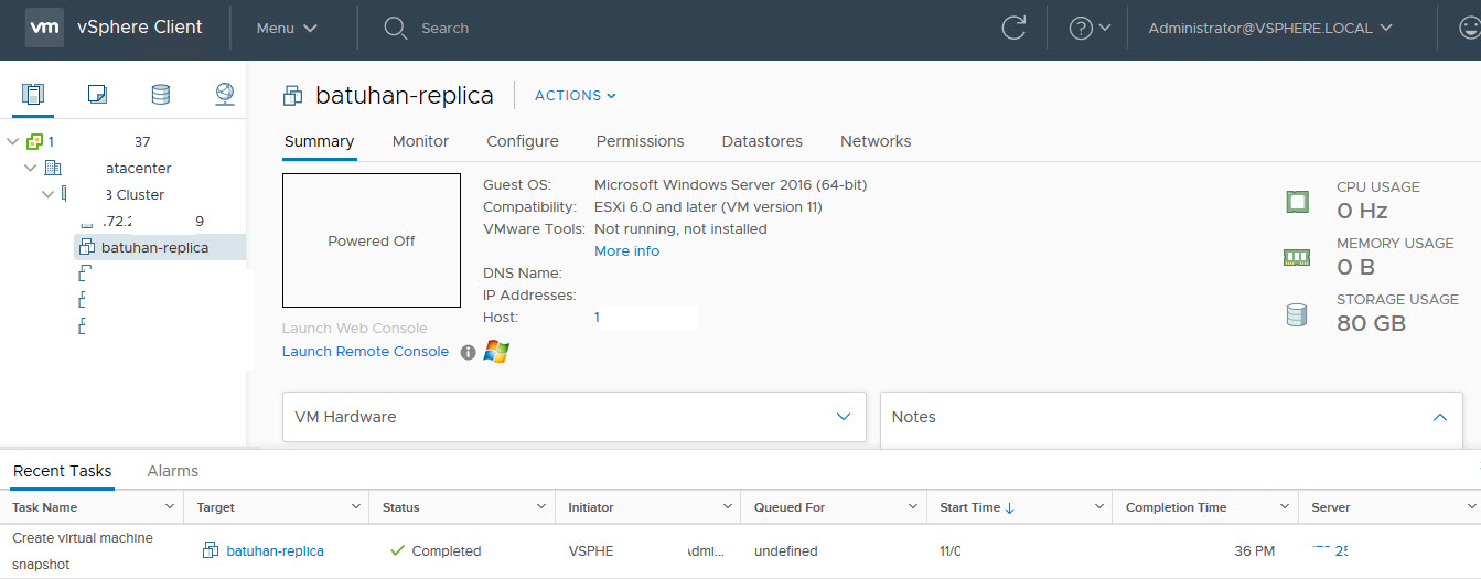 Virtual machine dashboard sayfasında’da görüldüğü üzere sanal sunumuzu Ankara lokasyonuna replikasyonu’nu hızlı ve başarılı bir şekilde gerçekleştirdi.