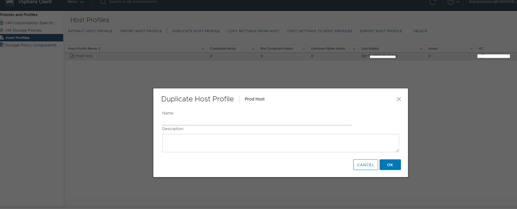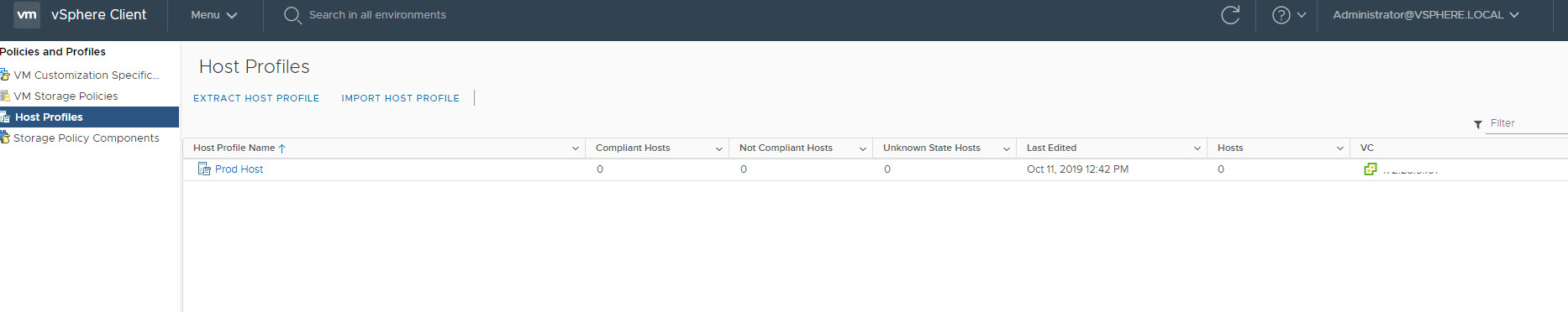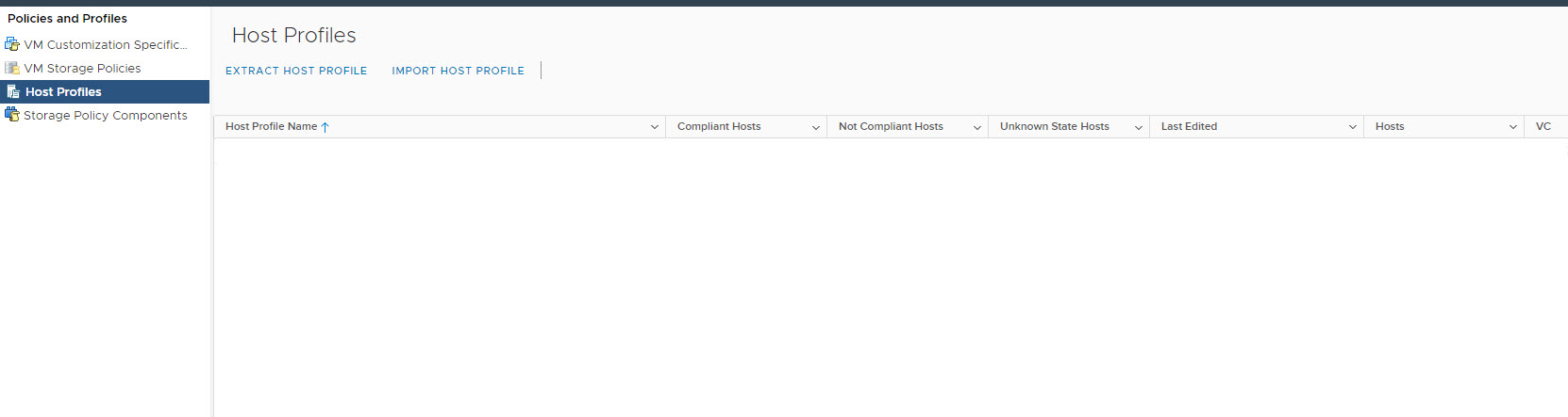 Policies and Profiles sayfası karşımıza gelecektir , buradan Host profiles > Exthact Host Profile tıklayarak ilgili hostu seçip profil ismi veriyoruz.