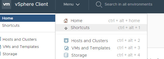 vSphere sayfamıza giriş yaptıktan sonra Home > Shortcuts tıklıyoruz.