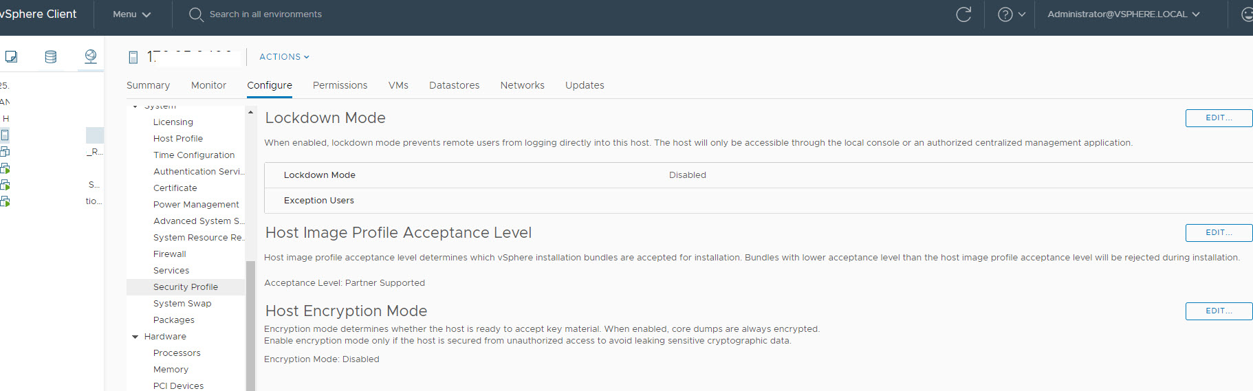 Esx’i hostumuzu tıkladığımızda sağ taraftaki menüden Configure kısmına geliyoruz. Buradan System > Security Profile > Edit tıklayıp Lockdown Mode menüsü karşımıza gelecektir.