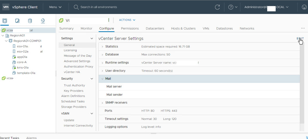 vSphere 7.0’a login olduktan sonra Configure > Settings > General >Edit menüsünü tıklayalım.