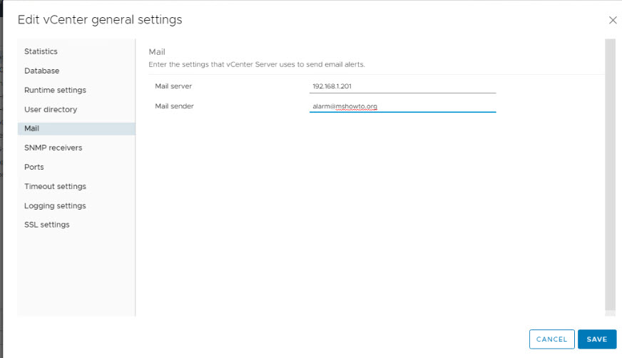 Mail server ayalarını yapmak için, bir e-posta sunucunuzun bilgileri ve , vCemter’ınızın FQDN’sini yazdıktan sonra save diyerek  settings sayfasından çıkalım.