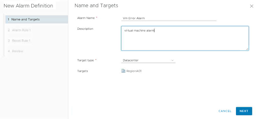 Alarm Name, Description bilgilerini doldurduktan sonra Target Type’dan ilgili datacenter’ımızı seçelim.