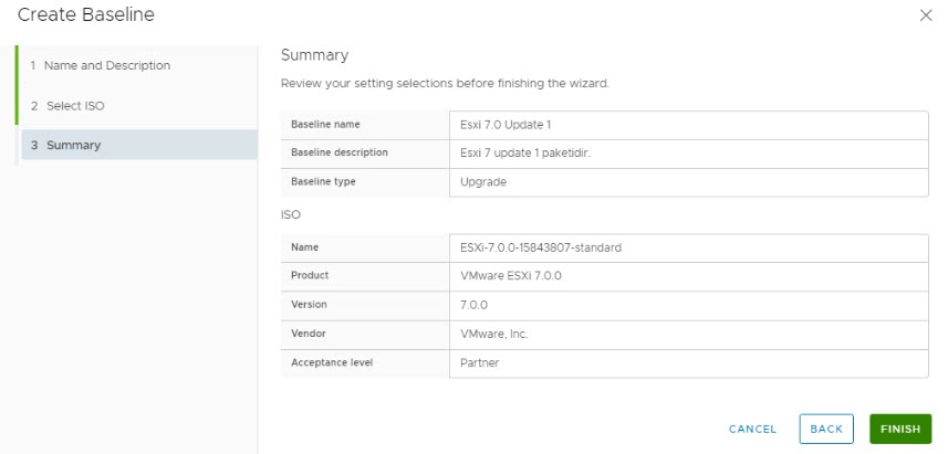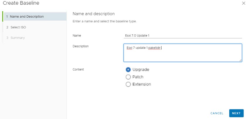 İmport işlemini tamamladıktan sonra baseline oluşturuyoruz. Name,Desciption kısmına siz herhangi birşey yazabilirsiniz. Upgrade yapacağımız için varsayılan olarak kalıyor next ile işlemimizi ilerletiyoruz.