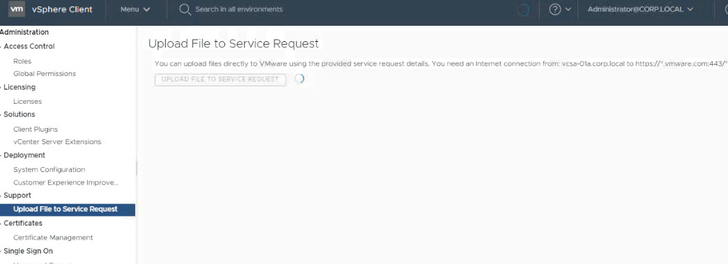 vSphere Client giriş yaptıktan sonra Menü > Administration > Support > Upload File To Service Reguest bölümüne geldikten sonra bizlere erişim yapacağımız linki göstermektedir.