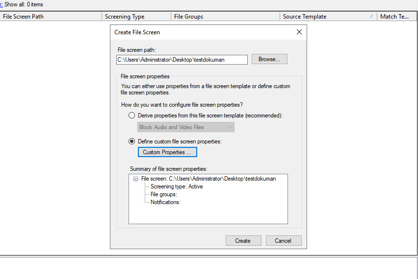 File Screen Templates’de sağ tıklayıp Create File Screen Template diyelim.